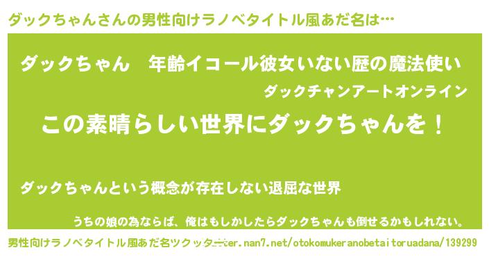 | 女子向けラノベタイトル風あだ名 | 『悪役ダックちゃんに転生したようですが、知った事ではありません』 |
