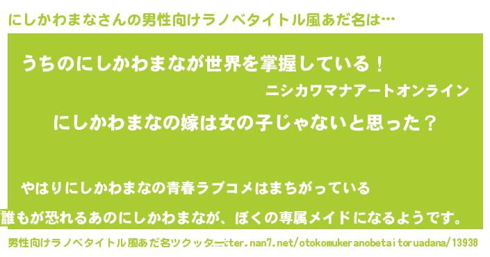 | 女子向けラノベタイトル風あだ名 | 『にしかわまなの卵を拾いまして』 |