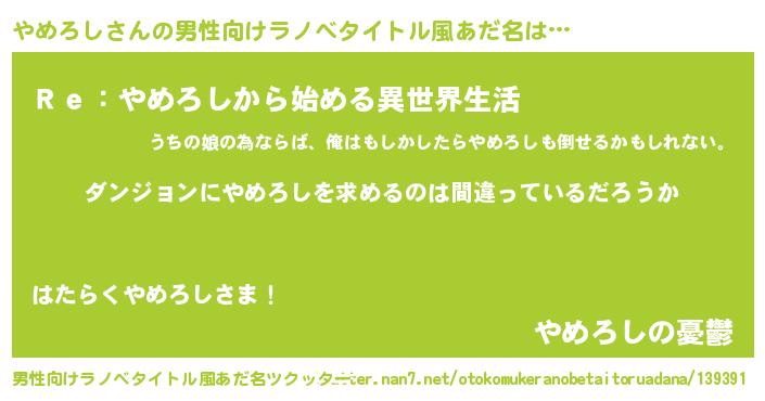 | 女子向けラノベタイトル風あだ名 | 『やめろしの卵を拾いまして』 |