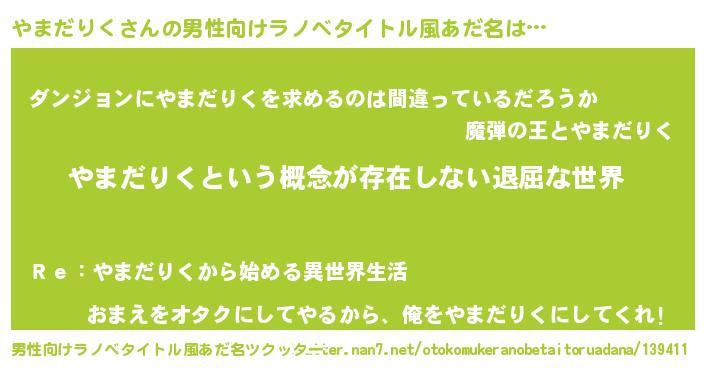 | 女子向けラノベタイトル風あだ名 | 『異世界で失敗しない100のやまだりく』 |