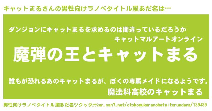 | 女子向けラノベタイトル風あだ名 | 『キャットまるが死なない童話 林檎のキャットまるの診療簿』 |
