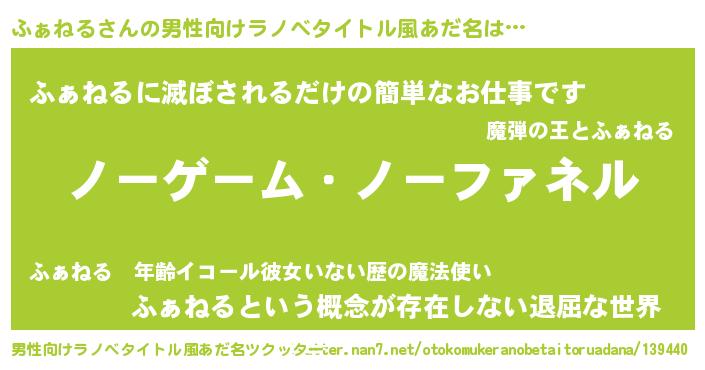 | 女子向けラノベタイトル風あだ名 | 『死神ふぁねるの再婚』 |