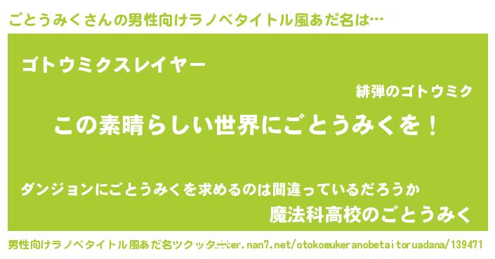 | 女子向けラノベタイトル風あだ名 | 『乙女ゲームの破滅フラグしかない悪役ごとうみくに転生してしまった…』 |