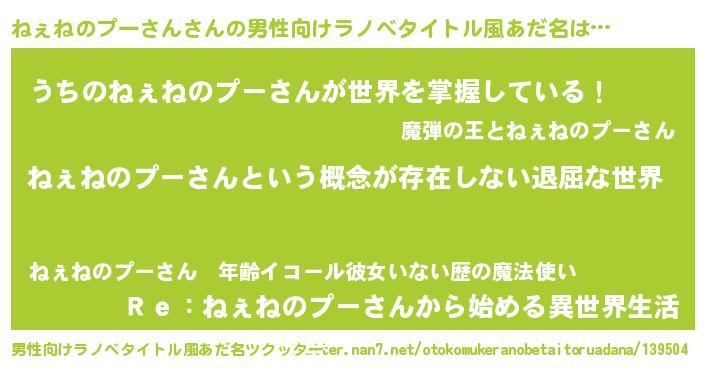 | 女子向けラノベタイトル風あだ名 | 『ねぇねのプーさんの契約王妃』 |