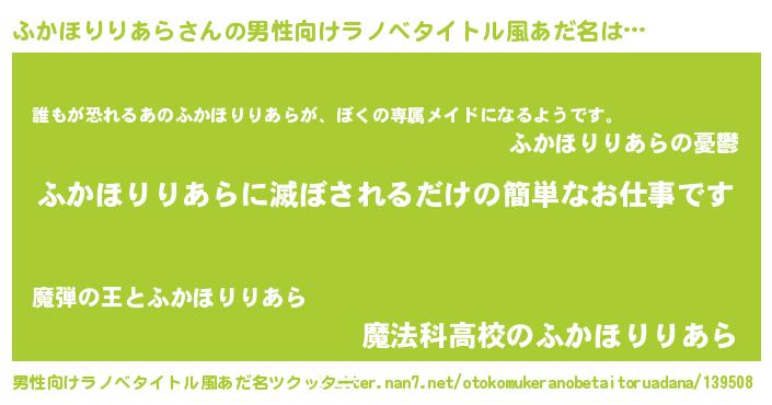| 胡散臭い通販商品みたいなあだ名 | 『前代未聞の水素水…その名も「ふかほりりあら」』 |
