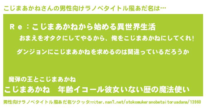 | 女子向けラノベタイトル風あだ名 | 『こじまあかねの卵を拾いまして』 |