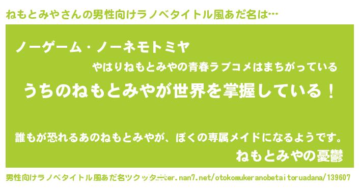 | ヒーロー風カッコイイあだ名 | 『慈愛の使者ねもとみや』『天弓騎士ネモ』 |
