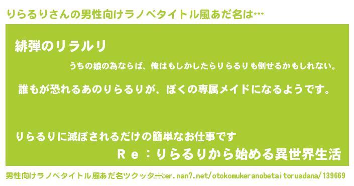 | 女子向けラノベタイトル風あだ名 | 『りらるりの契約王妃』『闇のりらるり』 |