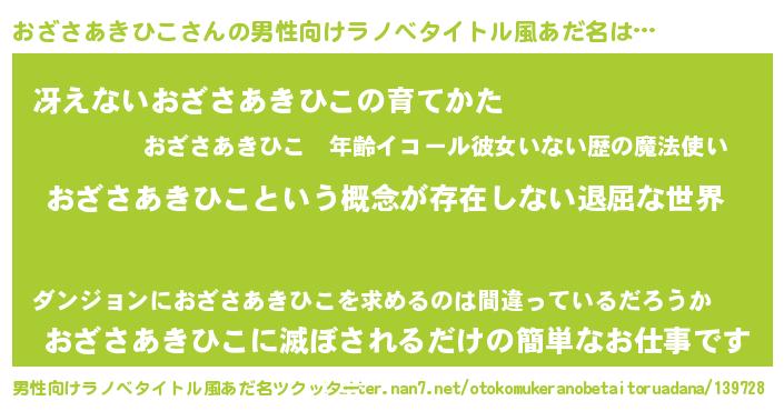 | 女子向けラノベタイトル風あだ名 | 『異世界で失敗しない100のおざさあきひこ』 |