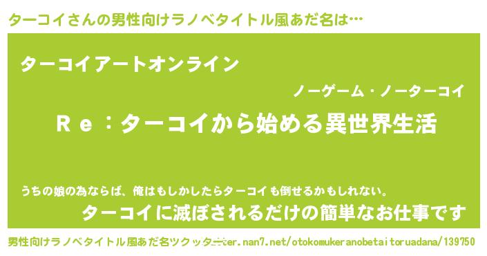 | 女子向けラノベタイトル風あだ名 | 『闇のターコイ』『死神ターコイの再婚』 |