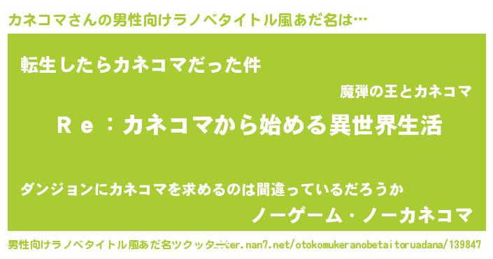 | 意味不明あだ名 | 『自称カネコマ』『もやし科カネコマ属』 |