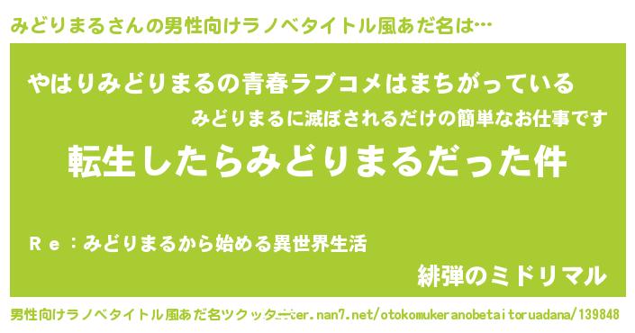 | 女子向けラノベタイトル風あだ名 | 『みどりまるの玉の輿計画!』 |