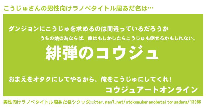 | 胡散臭い通販商品みたいなあだ名 | 『信頼と実績のサプリメント…その名も「こうじゅ」』 |