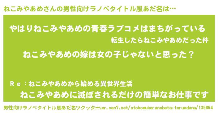 | 女子向けラノベタイトル風あだ名 | 『ねこみやあめ様がみてる』 |