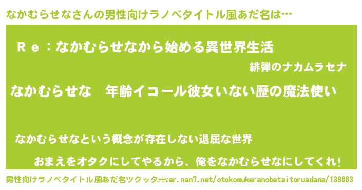 | 女子向けラノベタイトル風あだ名 | 『なかむらせなの玉の輿計画!』 |