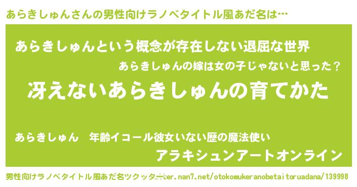 | 女子向けラノベタイトル風あだ名 | 『シンデレラあらきしゅん家の靴箱館』 |