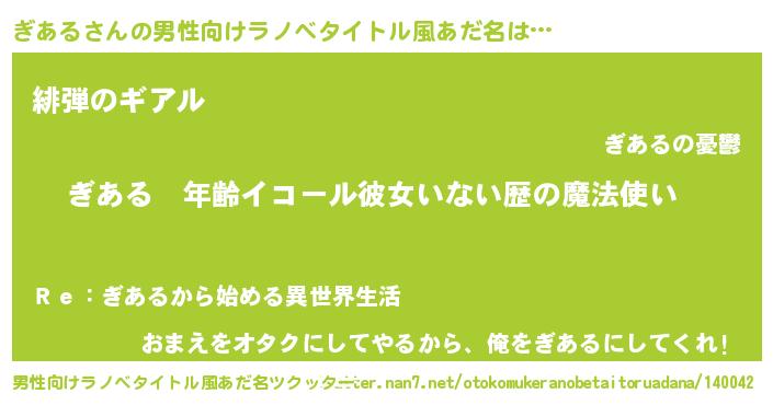 | 女子向けラノベタイトル風あだ名 | 『ぎあるの玉の輿計画!』『ぎある恋絵巻』 |