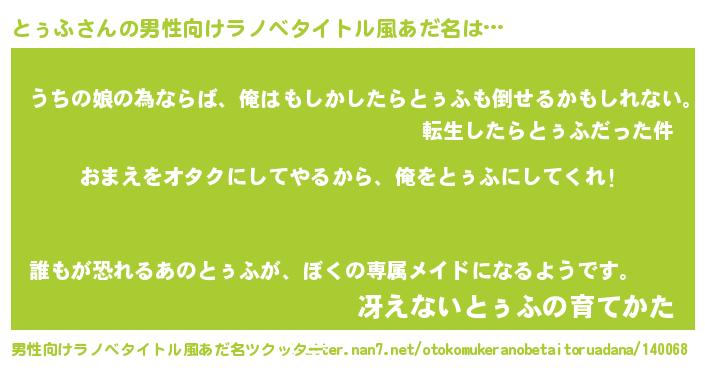 | 女子向けラノベタイトル風あだ名 | 『とぅふ夫妻のなれそめ』 |