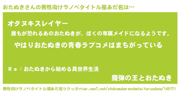 | 女子向けラノベタイトル風あだ名 | 『おたぬき伯爵の花嫁』『闇のおたぬき』 |