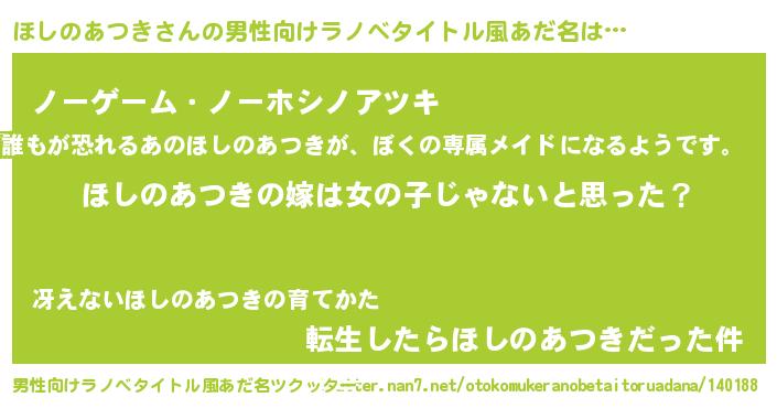 | 女子向けラノベタイトル風あだ名 | 『ほしのあつきの卵を拾いまして』 |