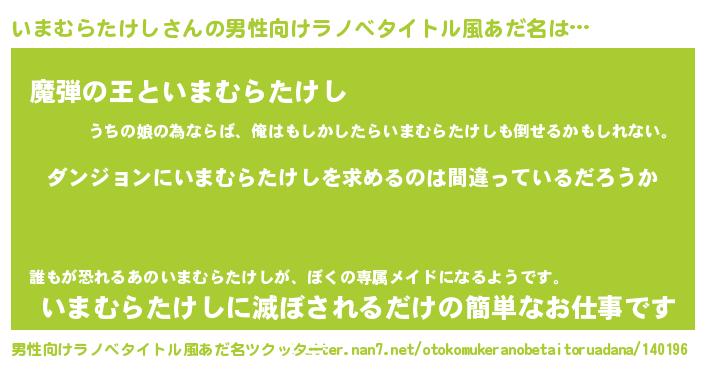 | 女子向けラノベタイトル風あだ名 | 『いまむらたけしの卵を拾いまして』 |