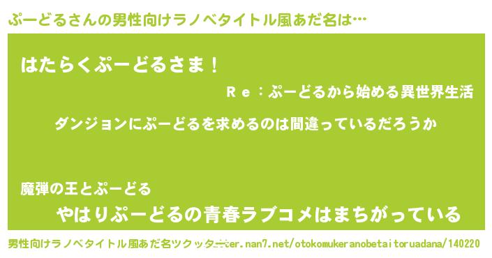 | 女子向けラノベタイトル風あだ名 | 『ぷーどるの卵を拾いまして』 |