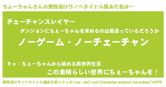 | 女子向けラノベタイトル風あだ名 | 『ちぇーちゃん恋絵巻』 |