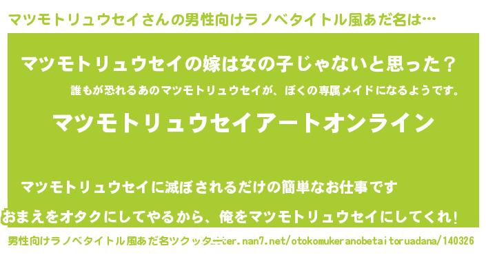 | 女子向けラノベタイトル風あだ名 | 『誰かこのマツモトリュウセイを説明してください! ~契約から始まるウェディング~』 |