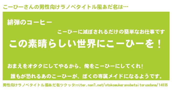 | 女子向けラノベタイトル風あだ名 | 『悪役こーひーに転生したようですが、知った事ではありません』 |