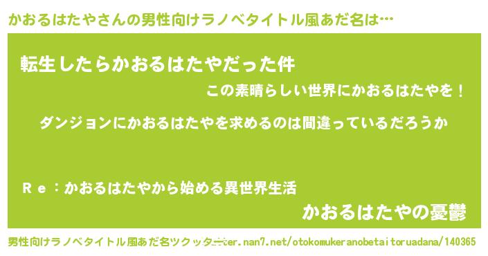 | 女子向けラノベタイトル風あだ名 | 『かおるはたやの卵を拾いまして』 |