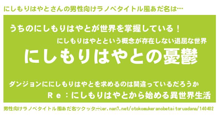 | 女子向けラノベタイトル風あだ名 | 『(仮)にしもりはやとのやんごとなき事情』 |