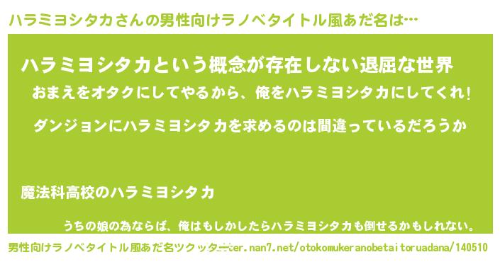 | 女子向けラノベタイトル風あだ名 | 『ハラミヨシタカの卵を拾いまして』 |