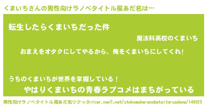 | 女子向けラノベタイトル風あだ名 | 『くまいち夫妻のなれそめ』 |