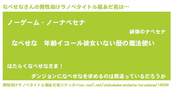 | 女子向けラノベタイトル風あだ名 | 『なべせなの玉の輿計画!』 |