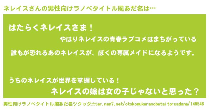 | 女子向けラノベタイトル風あだ名 | 『ネレイスの契約王妃』 |