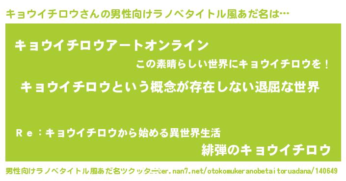 | 女子向けラノベタイトル風あだ名 | 『異世界で失敗しない100のキョウイチロウ』 |