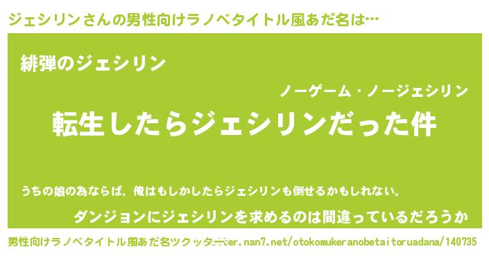 | 女子向けラノベタイトル風あだ名 | 『ジェシリンの玉の輿計画!』 |