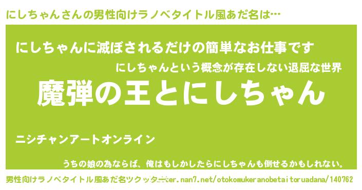 | 女子向けラノベタイトル風あだ名 | 『にしちゃんが死なない童話 林檎のにしちゃんの診療簿』 |