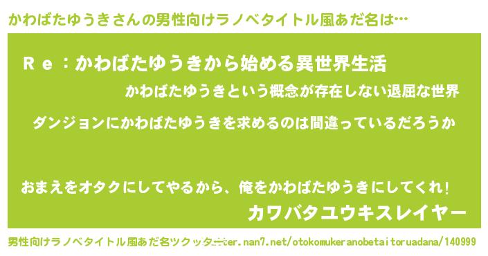 | 女子向けラノベタイトル風あだ名 | 『かわばたゆうきは平凡を望む』 |