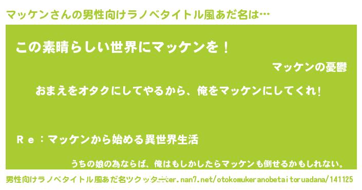 | 女子向けラノベタイトル風あだ名 | 『マッケン夫妻のなれそめ』 |