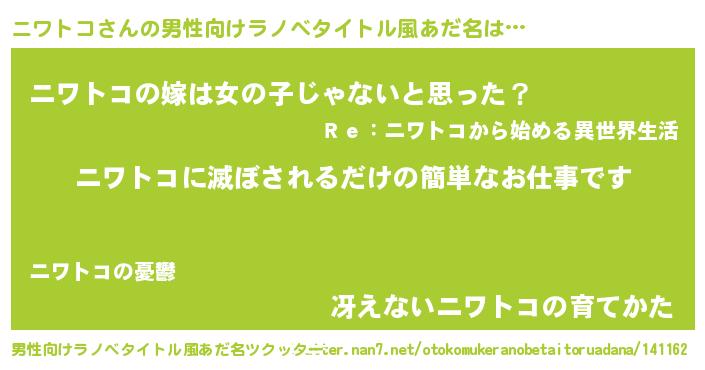 | ヘコむあだ名 | 『ニワっ子』『ニワにー』『なまこ酢』 |