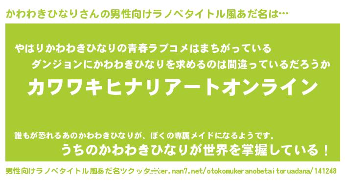 | 女子向けラノベタイトル風あだ名 | 『誰かこのかわわきひなりを説明してください! ~契約から始まるウェディング~』 |