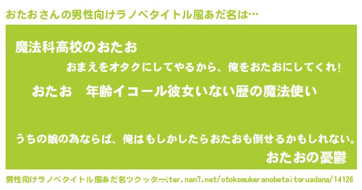 | 女子向けラノベタイトル風あだ名 | 『おたおの玉の輿計画!』『おたお恋絵巻』 |