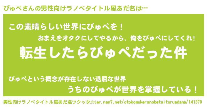 | ヘコむあだ名 | 『びゅぺ(遠い目)』『びゅにゅー』 |