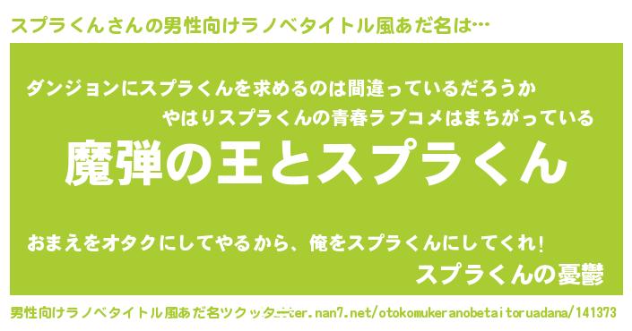 | 女子向けラノベタイトル風あだ名 | 『スプラくんが死なない童話 林檎のスプラくんの診療簿』 |