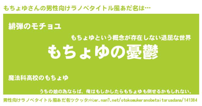 | 女子向けラノベタイトル風あだ名 | 『(仮)もちょゆのやんごとなき事情』 |