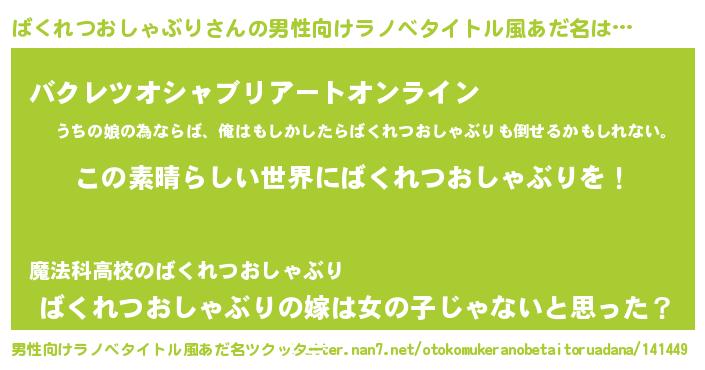 | 胡散臭い通販商品みたいなあだ名 | 『あなたにだけ特別に提供する限定10本のレアな日本酒…その名も「ばくれつおしゃぶり」』 |