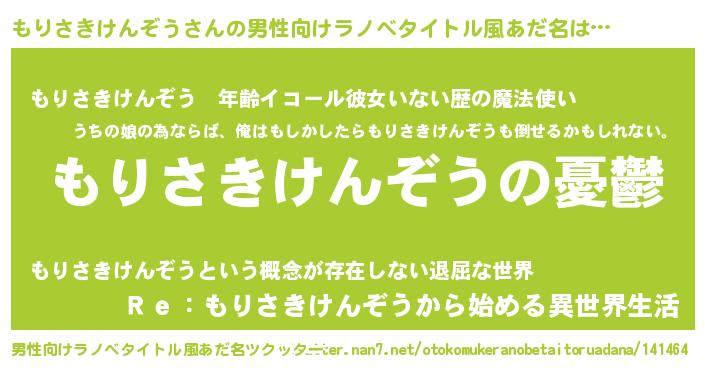| 女子向けラノベタイトル風あだ名 | 『(仮)もりさきけんぞうのやんごとなき事情』 |