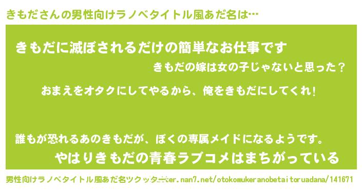 | 女子向けラノベタイトル風あだ名 | 『きもだ恋絵巻』『横柄きもだと宰相陛下』 |