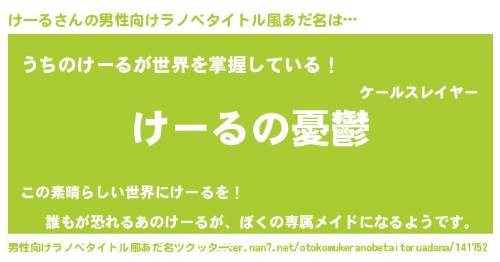 | 女子向けラノベタイトル風あだ名 | 『(仮)けーるのやんごとなき事情』 |
